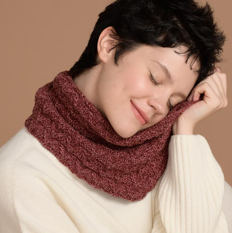 ベストな丈感で首元を彩るネックウォーマーは、輪で編み進むタイプ。表を見ながらぐるぐると、記号図の見た目通りに編めるので、模様編み初心者さんにもオススメです。