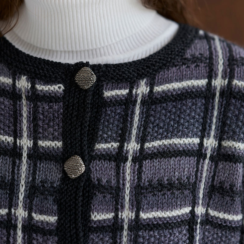 モノトーンでシックに決めた品のいいニットスーツ。タータンチェック風の模様の縦ラインは、引き抜きステッチで仕上げています。しわにならず、着回しも楽しめるので旅行のお供にもぴったり。 ※こちらのレシピはジャケットのみです。