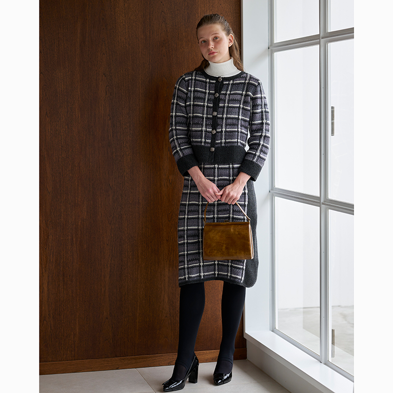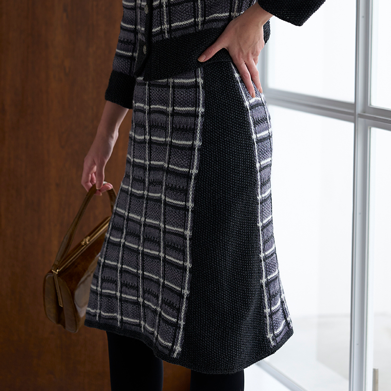 モノトーンでシックに決めた品のいいニットスーツ。タータンチェック風の模様の縦ラインは、引き抜きステッチで仕上げています。しわにならず、着回しも楽しめるので旅行のお供にもぴったり。※こちらのレシピはスカートのみです。