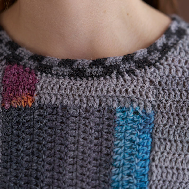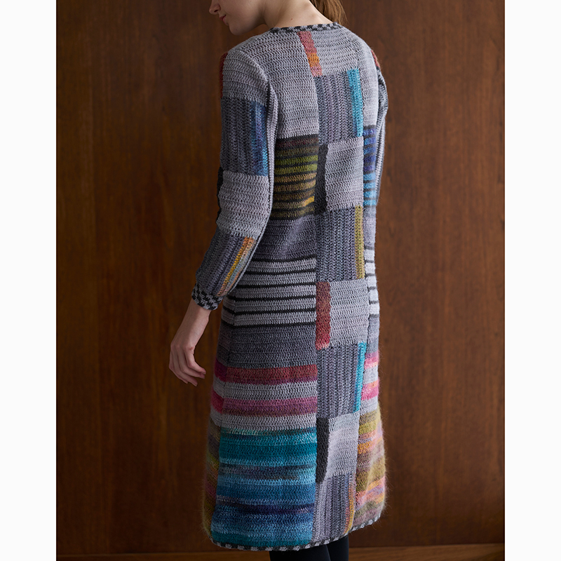 材料:ダイヤモンド毛糸 ダイヤボルドー 薄いグレー系段染め(2401)240g/8 玉、濃いグレー系段染め(2408)140g/5 玉。ダイヤドミナ 黄系段染め(393)・青系段染め(406)各95g/各3 玉、赤系段染め(396)45g/2 玉。ダイヤミーサ 黒(1308)85g/3 玉。
