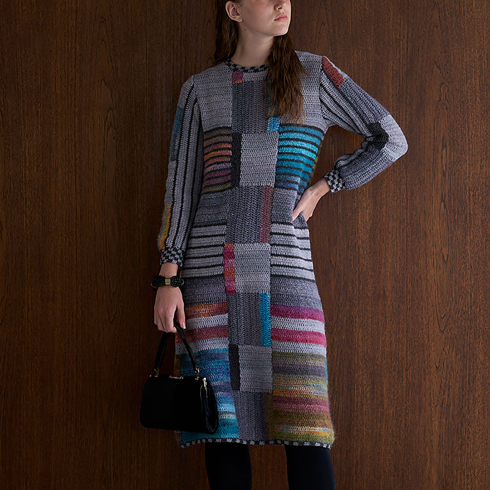 シンプルな長編みベースの編み地をつないだ、かぎ針編みのパッチワークがレトロ可愛いニットワンピース。ヴィンテージ感をさらにパワーアップさせる、市松模様の縁どりもチャームポイントです。