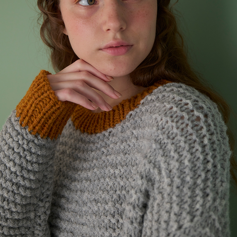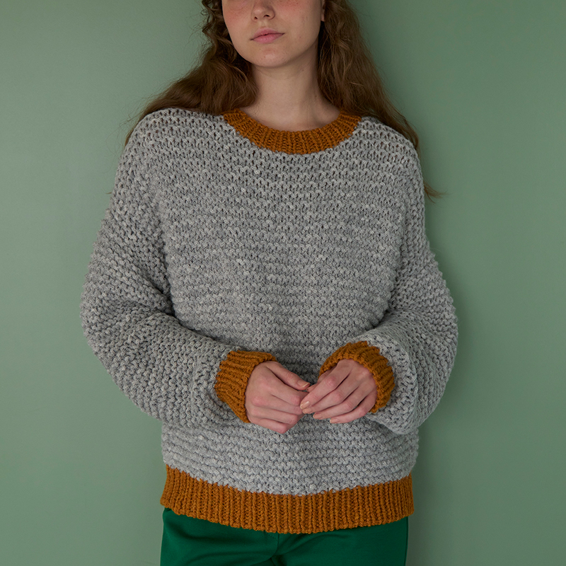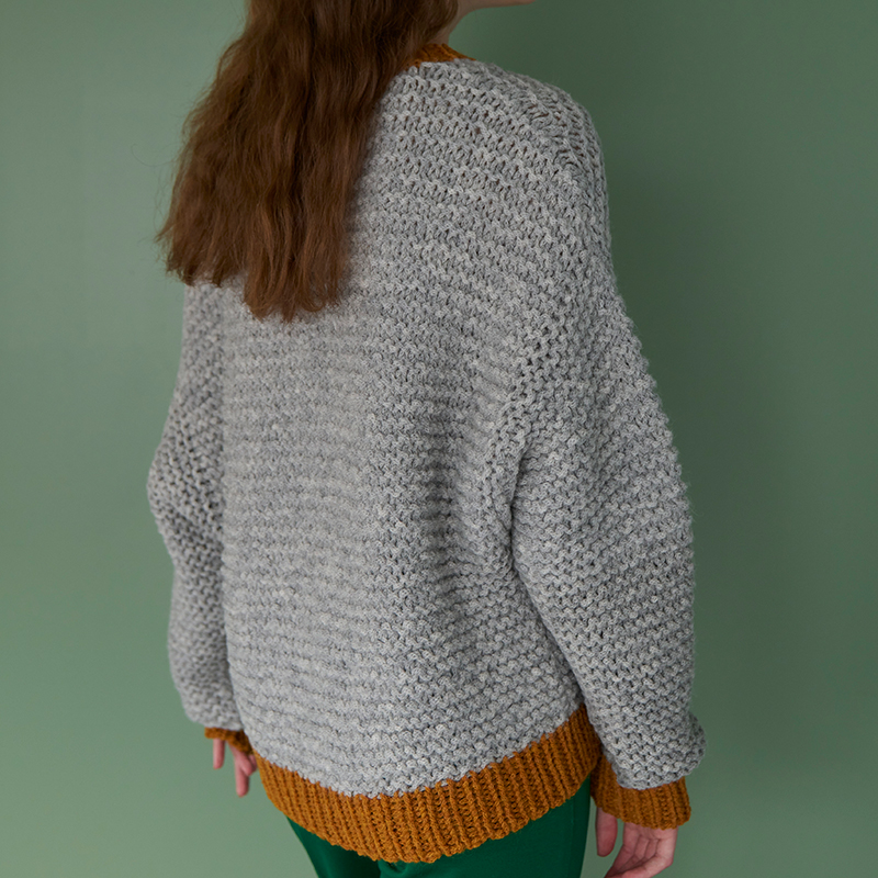 ガーター編みと配色のゴム編みでざくざく編める、シンプルなゆったりプル。広めの袖ぐりと長めの袖がポイントです。