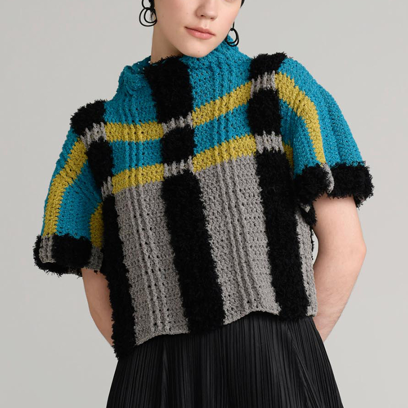 長編みをベースにしたかぎ針編みの半袖プルは、引き上げ編みのラインをアクセントに。ファーをブロックづかいすることでモダンな印象に仕上がります。