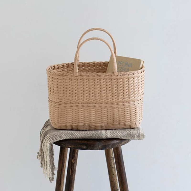 北ヨーロッパのバルト海に面したラトビアの伝統的な手仕事、天然素材のヤナギで作られる「かご」に魅せられて。紙バンドで追いかけ編み、3本縄編み、斜め編みなどの技法を使い、ラトビアのスタンダードな「かごバッグ」をデザインしました。