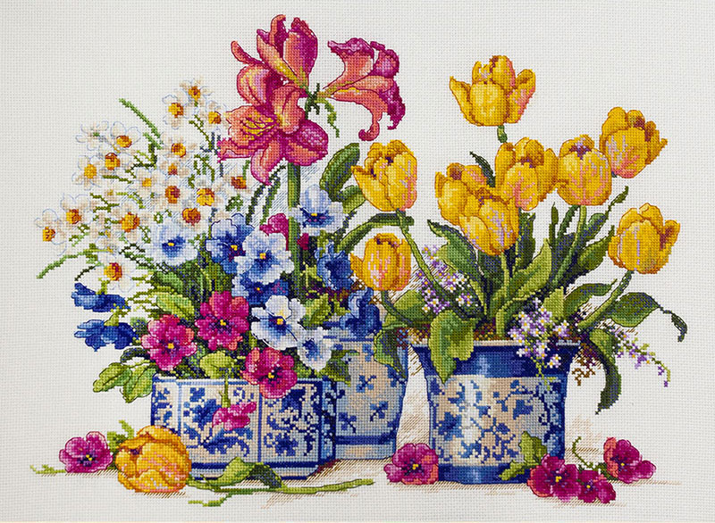 【キット作り方つき】青い装飾が美しい花器に、華やかな春の花々を飾ったクロスステッチ作品です。上級の方へ。