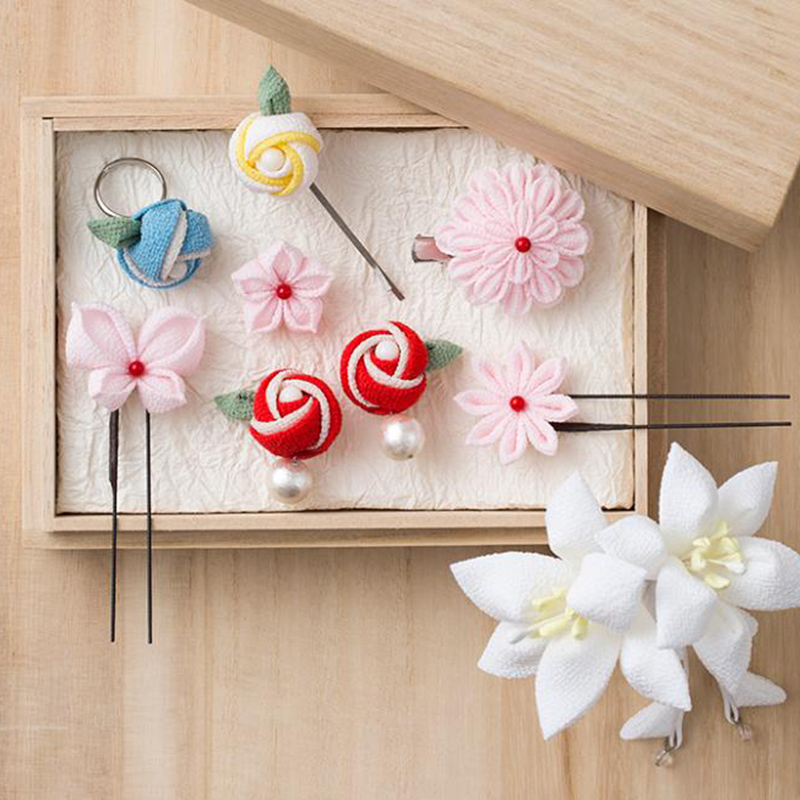 - high-quality silk crepe fabric,U-pins,styrofoam ball,red coral parts,white coral,parts,cotton pearls,crystal balls,T-pins,brooch pin,2-way clip,hair pin,plate spring,earring,ring stand,comb,floral tape,cardboard for foundation,tweezers,Stall pins,Wire,flower core,How to Make Instructions(Japanese)