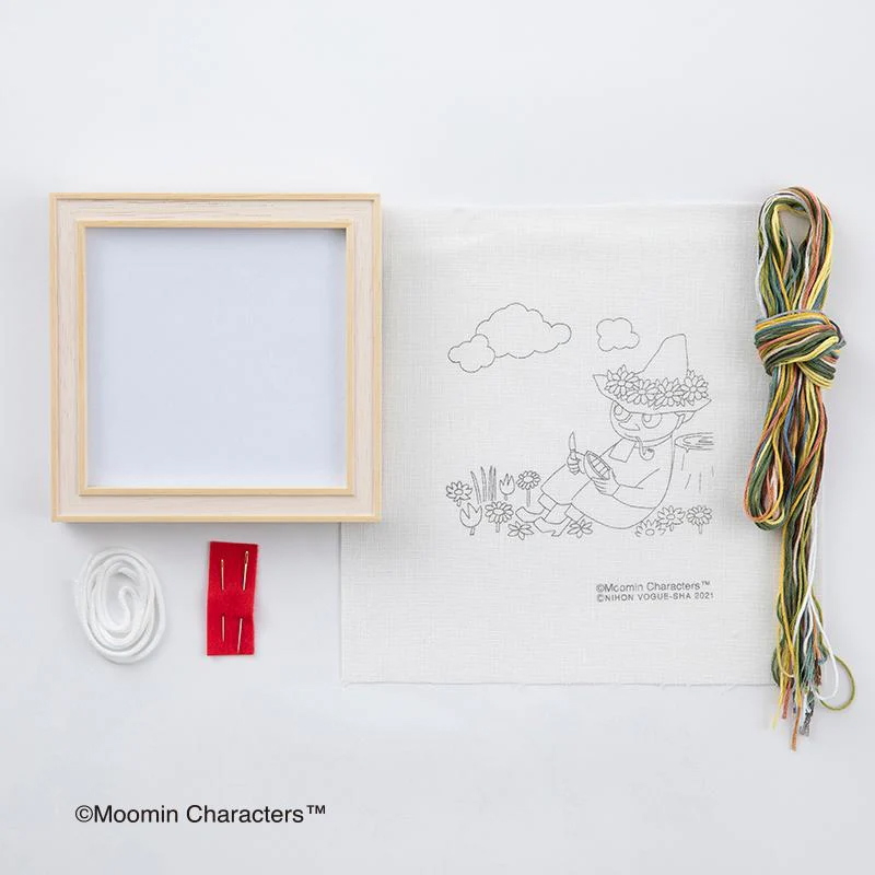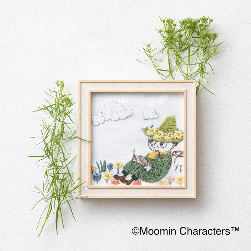 独りの時間も大切にするスナフキンは、木のボートを彫りながら、 今日も雲の下で自分の時間を過ごしています。 8種類のステッチでムーミン谷の景色をひと針ひと針刺しゅうをします。