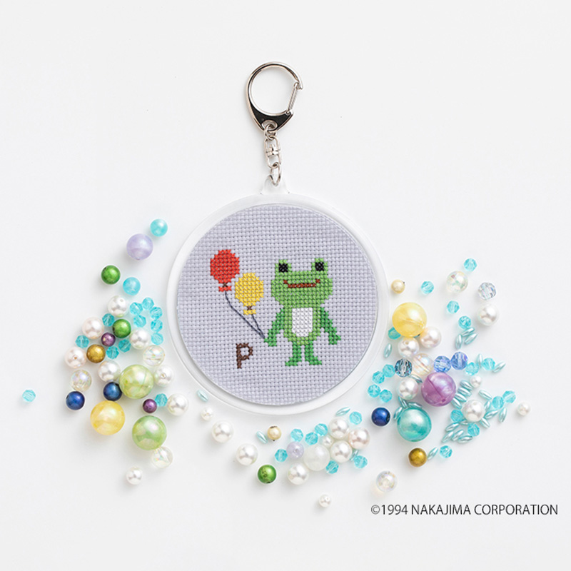 一針一針刺しゅう糸で描くかえるのピクルスをゆっくり楽しみましょう。お子さまと一緒に作るのもおすすめです。 仕上げにお好きなアルファベット1文字を添えて。 刺しゅうができたらキーホルダーパーツに入れて、でき上がり。カバンなどにつけて、ピクルスと一緒にお出かけしましょう♪