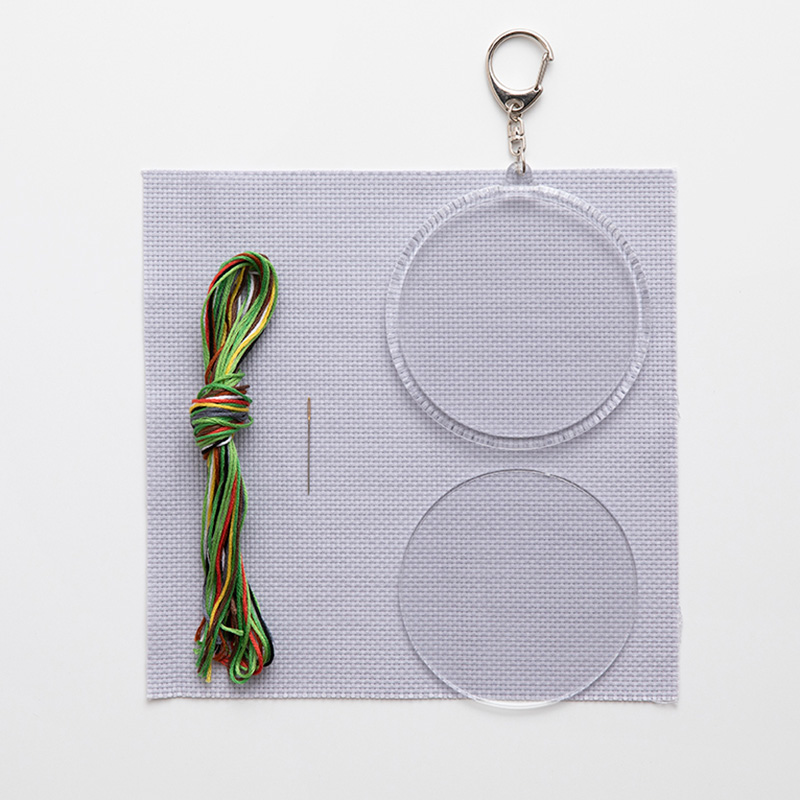 一針一針刺しゅう糸で描くかえるのピクルスをゆっくり楽しみましょう。お子さまと一緒に作るのもおすすめです。 仕上げにお好きなアルファベット1文字を添えて。 刺しゅうができたらキーホルダーパーツに入れて、でき上がり。カバンなどにつけて、ピクルスと一緒にお出かけしましょう♪