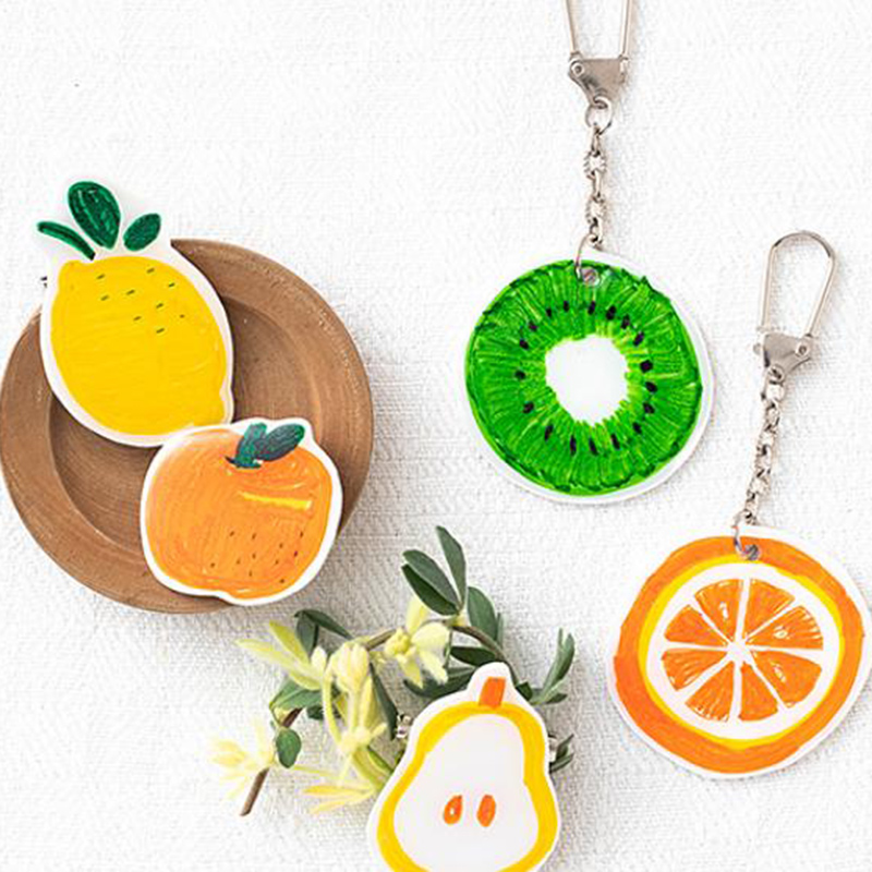 フルーツのブローチとキーホルダー/ブローチ:(レモン)約 縦30×横43mm、(みかん)約 縦30×横31mm、(洋ナシ)約 縦40×横30mm、キーホルダー:約 直径40mm (全てプラバン部分)