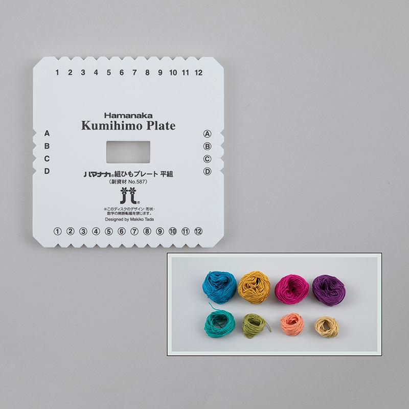 初心者にも簡単に組ひもを作ることができる道具として考案された、平たい形状のプレートです。1辺が約15cm、厚み1cmの樹脂(発泡ポリエチレン)製で、軽くて扱いやすいのが特徴。断面が平らな「平組」の幅の広いものやジグザグ形など、簡単に組ひもが作れます。 プレートの上下に12箇所ずつ、左右に4箇所ずつスリットが入っています。