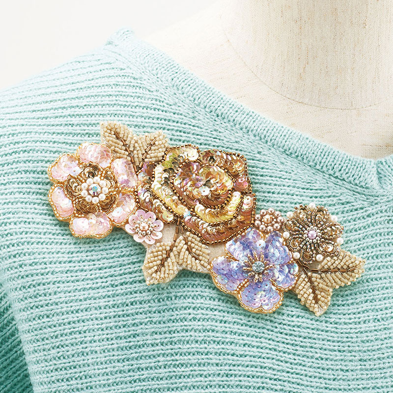 ニットアイテム用にブローチピン代わりで使える、針のないソフトな留め具です。モチーフにソフトピンを縫いつけて編み地に差し込み、裏側からキャッチで留めます。大きなモチーフも編み地を挟んでしっかり留まって安心です。