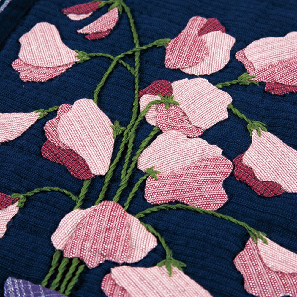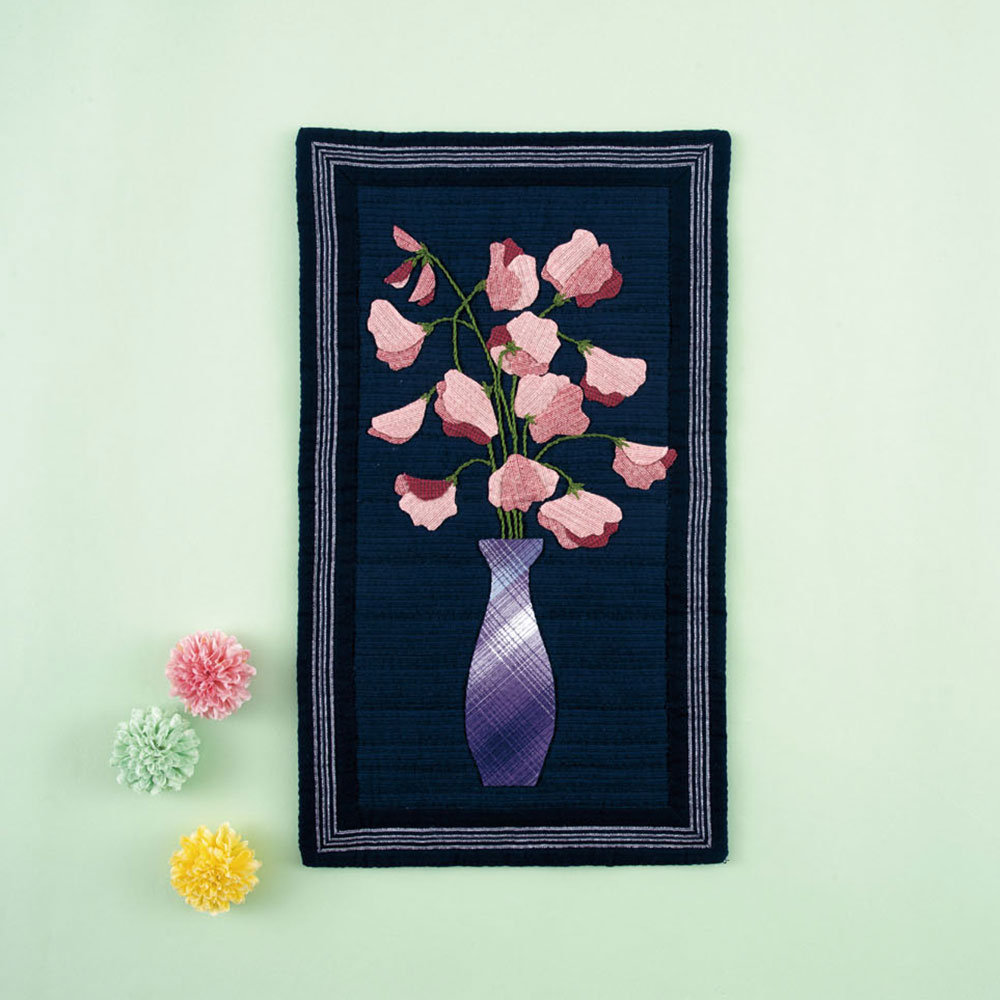 【キット作り方つき】花瓶に活けた可憐なピンクのスイートピーを、徳島県の伝統工芸・阿波しじら織でアップリケしました。