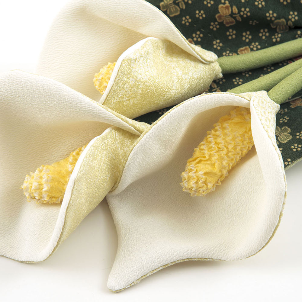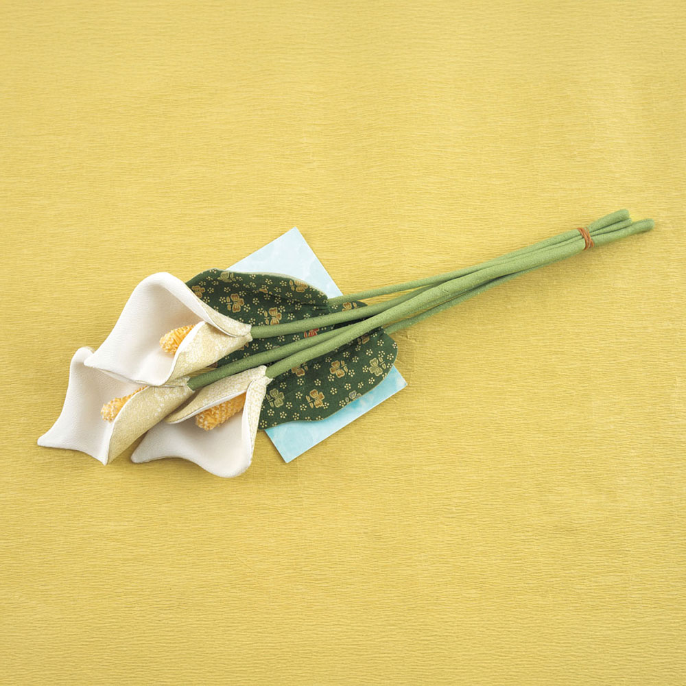 【古裂・キット作り方つき】置いても花器などに挿しても楽しめる、カラーの花3本と葉2本が作れます。茎部分は布ひもにワイヤーなどを入れて曲げられる仕上がりに。