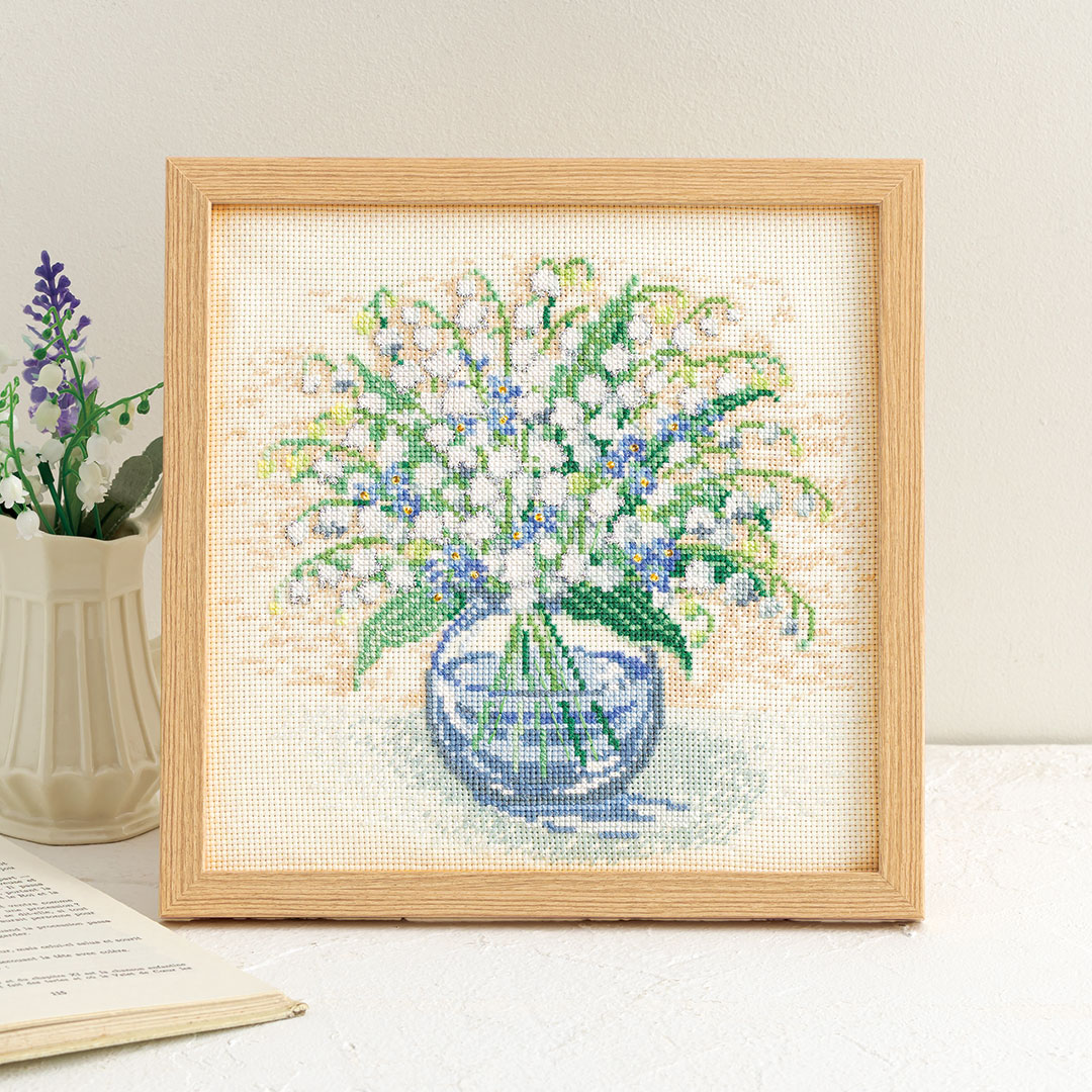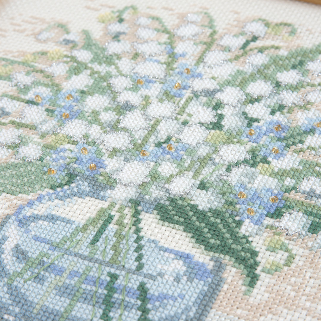 [フレームつき] すずらんと忘れな草をガラスの花器に生けたデザイン。すずらんの可憐な花をクロスステッチで表現。銀糸とビーズを使用しています。初~中級の方向け。
