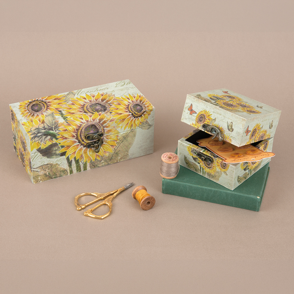 ●完成品●木製のボックスに、アンティーク調のひまわり柄のプリントを貼ったボックスの大小2個セットです。開閉は金具パーツで。ボタンやリボンなどソーイングアイテム入れやジュエリーケースやプレゼントボックスでも。