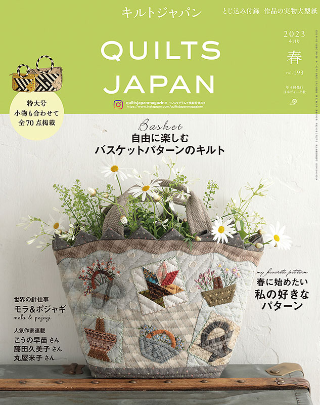 人気の高い「バスケット」のパターンを大特集。他にも人気作家による花や幾何学のお気に入りパターン使いの作品も掲載。丸屋米子さん、藤田久美子さん、こうの早苗さんの人気連載に加え、モラやポジャギなど世界の手仕事も紹介。つなぐ人、展示会レポート、キルトにまつわる取材ページも充実です。