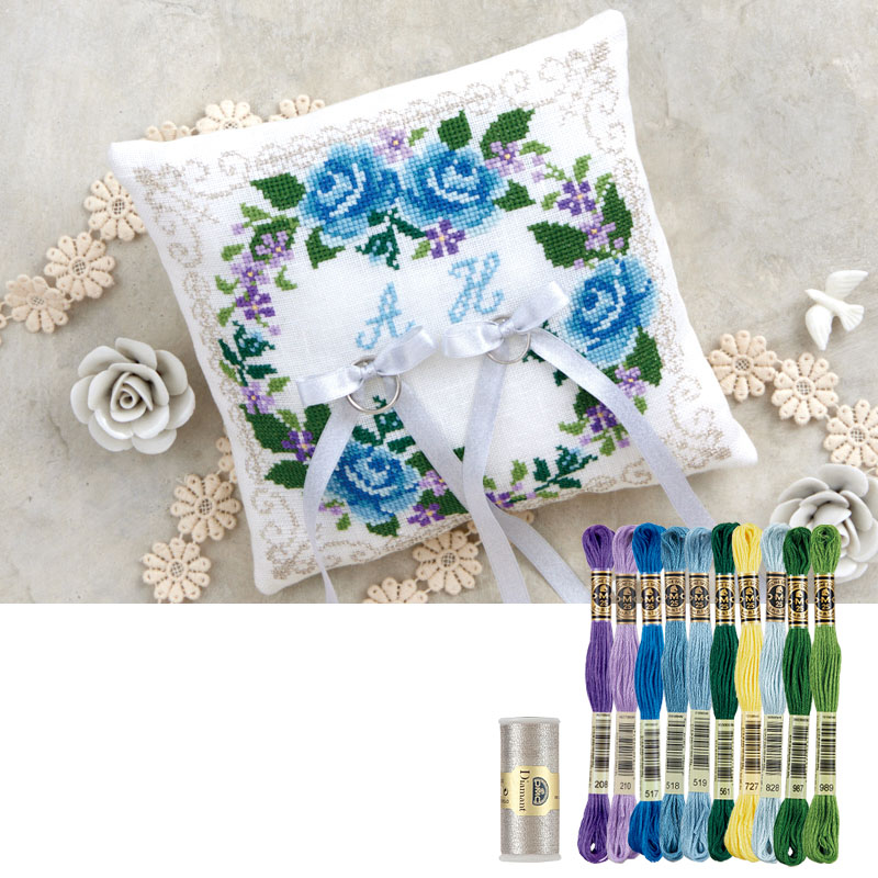 ステッチイデーvol.39 30ページ掲載の作品に使用しているDMC25番刺しゅう糸とラメ糸のセットです。結婚式にブルーの小ものを取り入れると幸せになれるという言い伝えにちなんで、渡部友子さんがセレクトした清楚な色の組み合わせです。