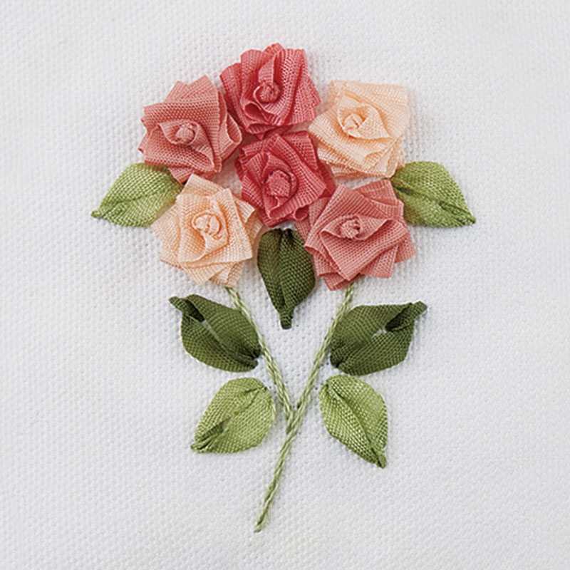 ステッチイデーvol.36 11ページ掲載の作品「バラとスミレ」に使用した、MOKUBAエンブロイダリーリボンをセットでお届けします。リボン刺しゅう専用の繊細な美しいリボンです。