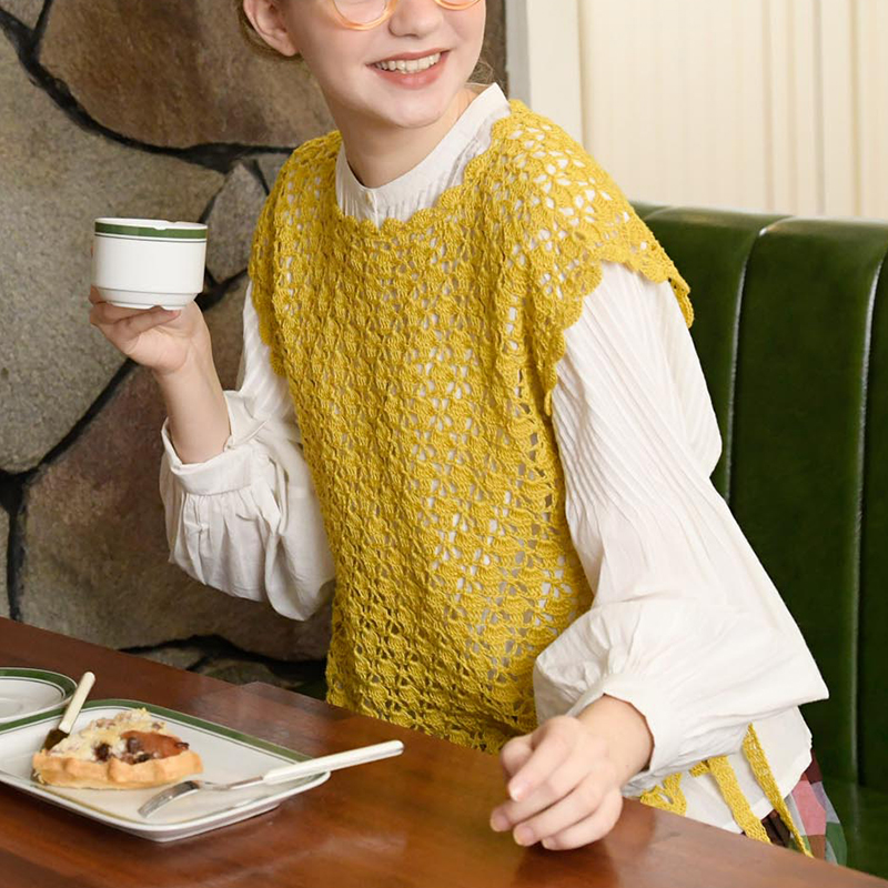流行中のサイドオープンベストもかぎ針編みで。ハリのあるリネン糸で編む小さな単 位の模様編みは、どんなファッションにも合わせやすく、パンツ派にもスカート派にもおすすめ。トレンドカラーのイエローはコーディネートのアクセントになります。
