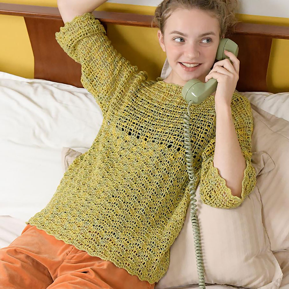 山型に連なる模様と方眼編みベースの模様をヨーク部分で切り替えて変化をつけています。さらりとした肌触りでニュアンスのあるミックス糸は顔映りも良く、年齢を問わずにお楽しみいただけます。