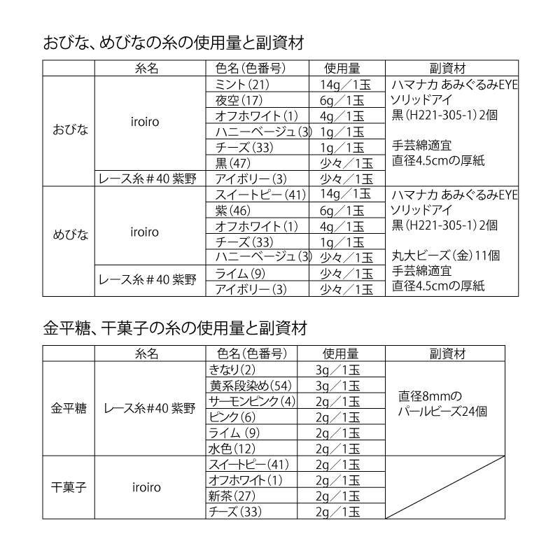 材料:DARUMA iroiro、レース糸#40 紫野。糸の色名、色番号、使用量、副資材は図中の表を参照して下さい。