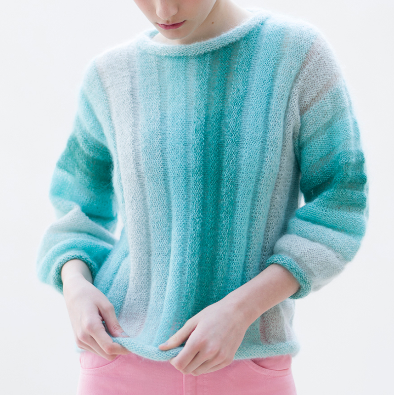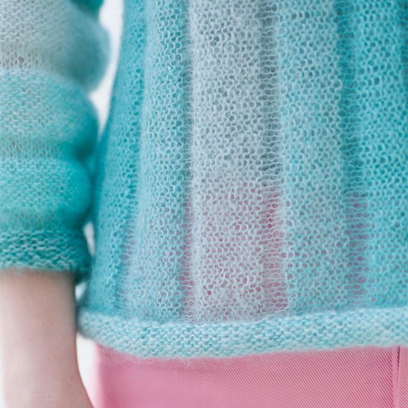 3色の糸から紡ぎ出される、爽やかなカラーグラデーション。横編みの模様に加え、2本どりと1本の編み分けがプリーツのように、エアリーで柔らかな雰囲気を醸し出します。模様が美しく続く袖にも注目です。
