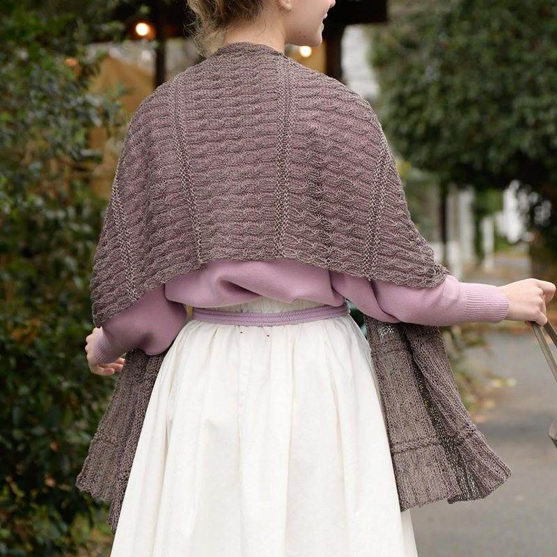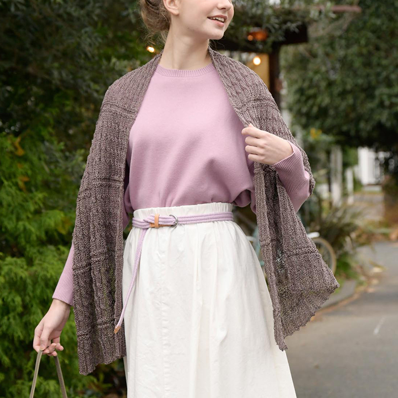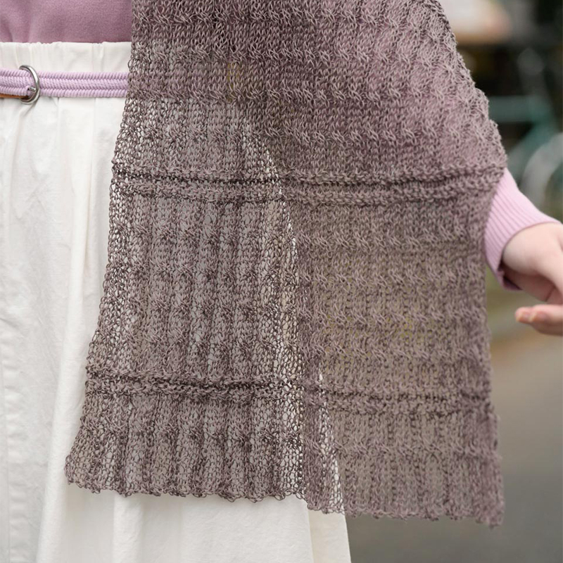 さらりとしたリネン糸で編んだ、風に揺れる軽やかなロング丈のショール。ベースのケーブル模様は透け感を楽しめる1本で編み、あいだは2本どりの模様で緩急をつけています。糸の渡し方にコツがあり、飽きずに編めます。