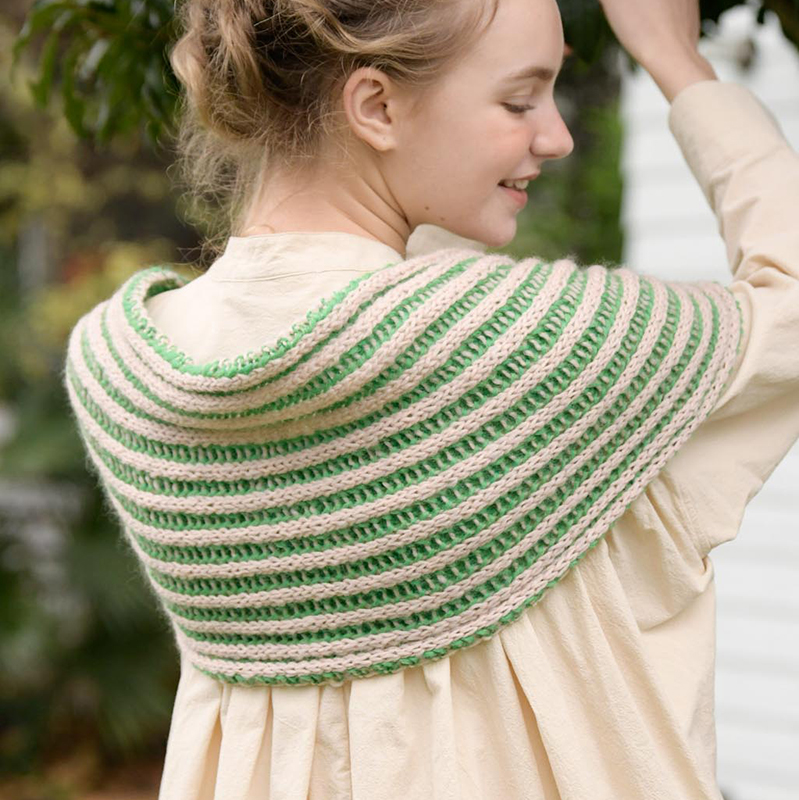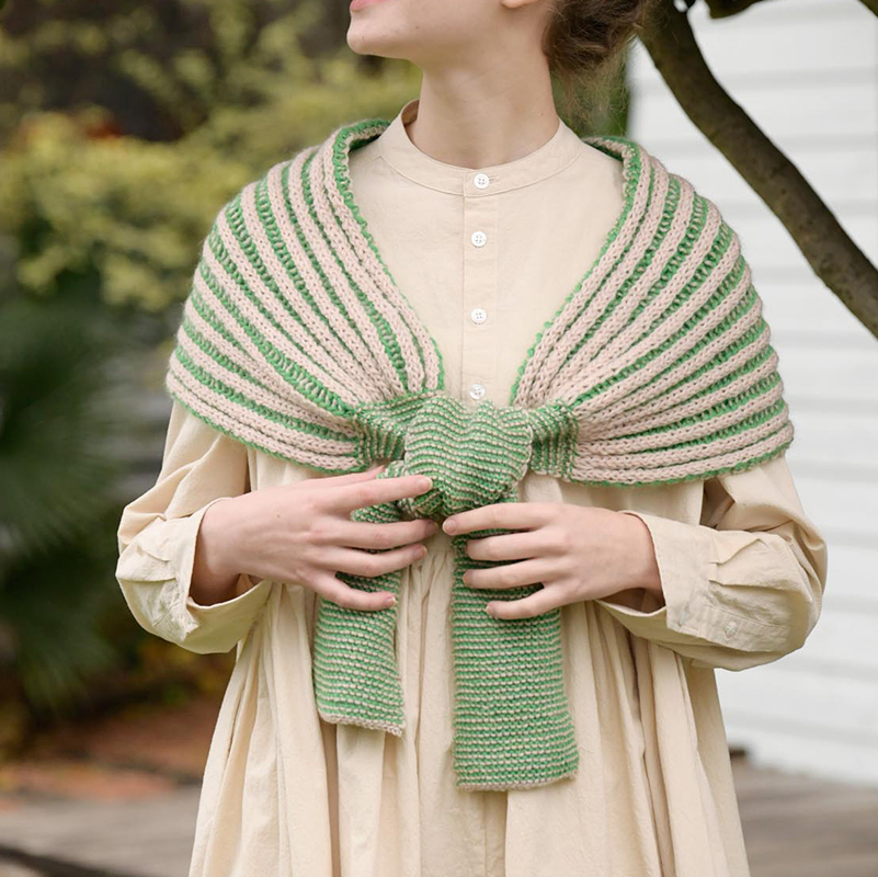 ライムグリーンとダスティピンクの色合わせが可愛い、両端をボウのように結べるノスタルジックスタイルなショールです。本体は引き上げ編みを2目ゴム編み状の縞に編むことでリバーシブルに楽しむことができます。