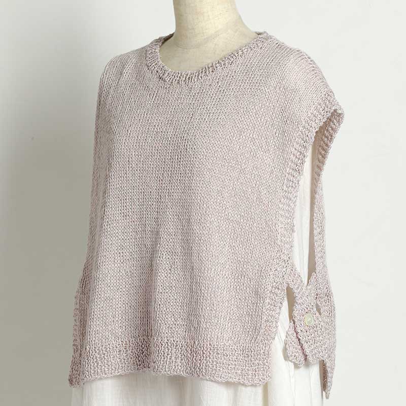 【キット作り方つき】2種の糸を引き揃えて編む、さらりとした肌触りのベストです。脇はオープンにしたまま、広幅のひもとボタンで留める作り。引き返し編みなどを 使った、中級の方向きのデザインです。