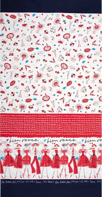 [オックス]やや厚手のオックス地に、ハイファッションの女性やおしゃれなモチーフを描いたボーダープリントです。女性のボーダー幅は約22cm。ボーダーを生かしたバッグなどにも。