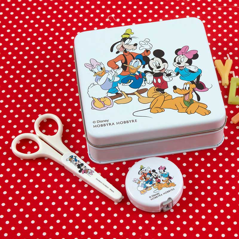 【限定50】Mickey&Friendsのイラストが入ったソーイング缶です。メジャー、ミニばさみ、ピンクッションが入っています。プレゼントにもおすすめ。