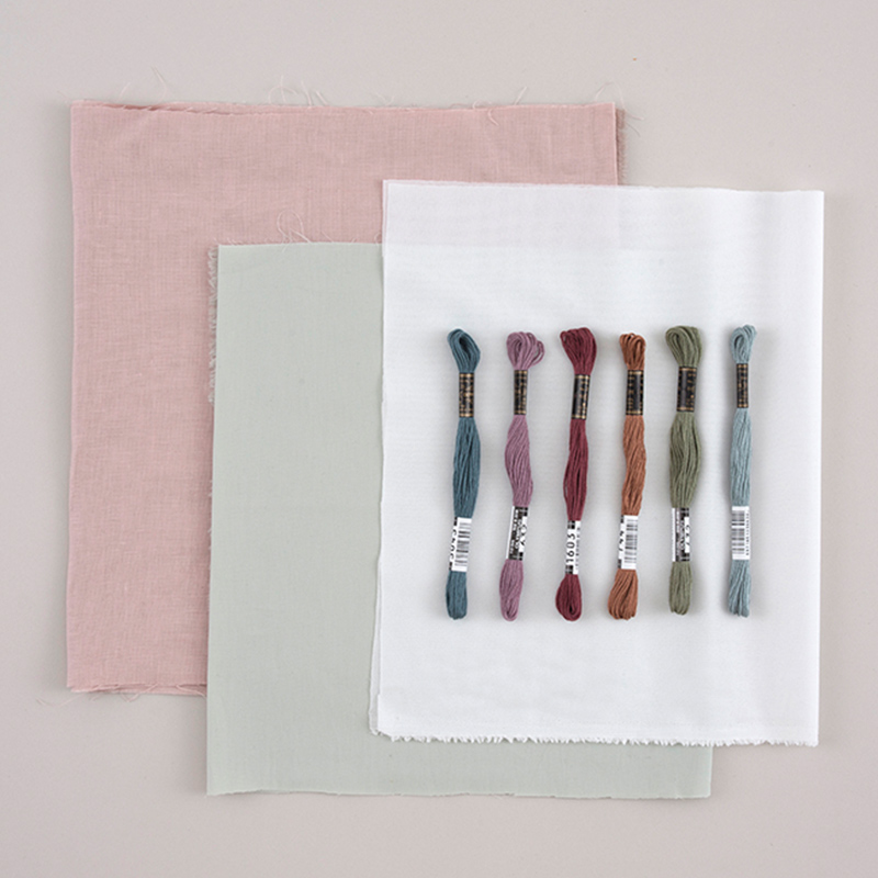 マカベアリスさんセレクトのCHECK&STRIPEのグレイッシュピンクリネンやミントグリーンの裏布などがセットされたスペシャルキットです。