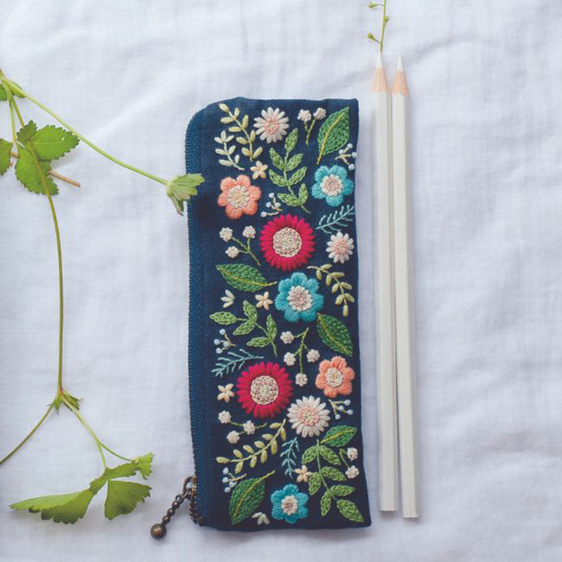 濃紺の生地に色とりどりの花を咲かせたペンケース。全部で19色もの刺繍糸を使った、贅沢な作品です。
