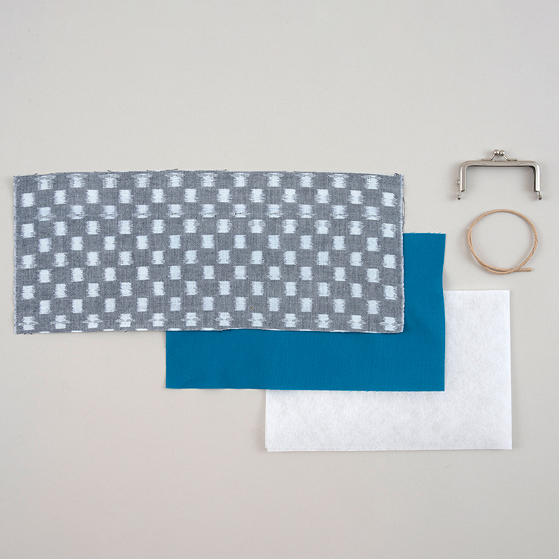 表布(久留米絣)、裏布(シーチング)、口金、接着芯、紙紐、作り方説明書、実物大型紙
