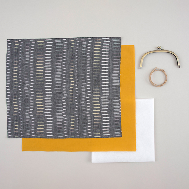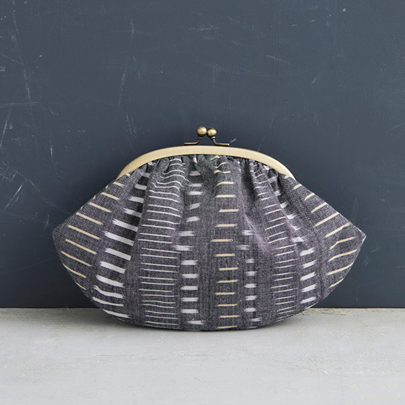 口金をはめる作業は、慣れないうちは難しく感じるかもしれませんが、一度コツを覚えてしまえば、面白くてたまらなくなるはずです。表布には、和服地の久留米絣を使っています。久留米絣の温かみのある素朴な柄を味わいながら、がまぐち作りを楽しんでください。