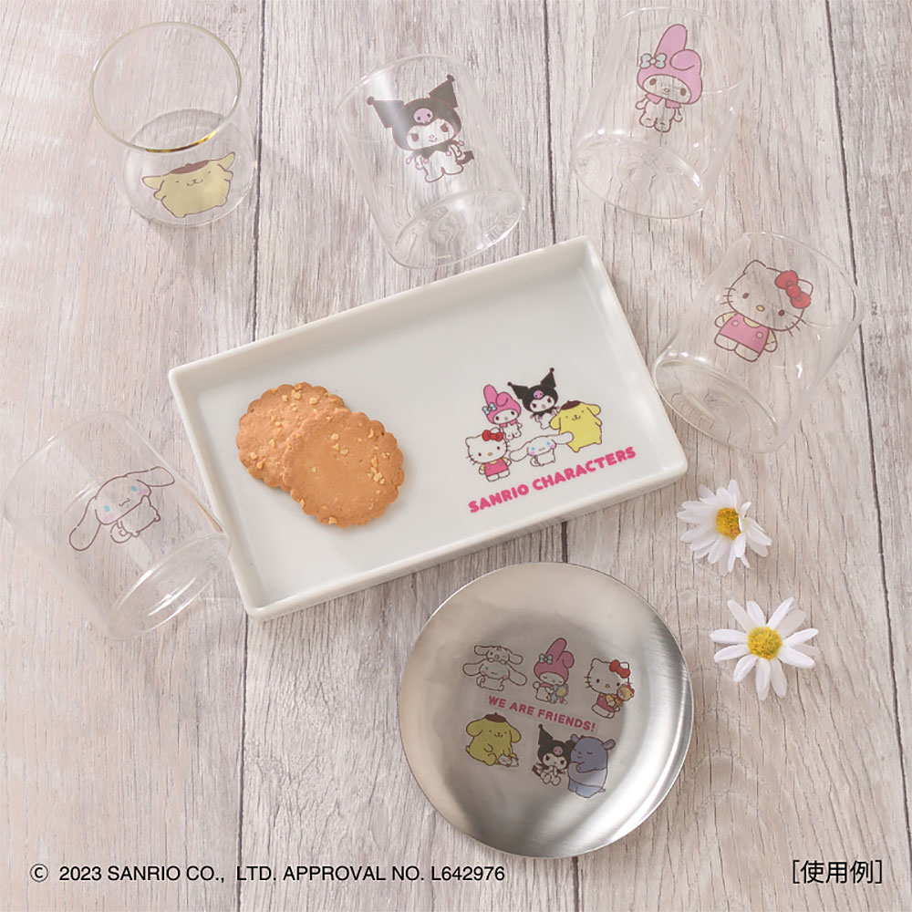 ハローキティ、シナモロール、ポムポムプリン、マイメロディ、クロミがレイアウトされた贅沢な一枚。