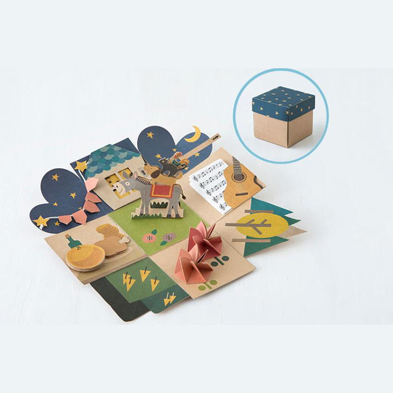 イラストがプリントされた紙を切り貼りして組み立てる、楽しい仕掛けが施された、開けて飛び出すポップアップBOX。
