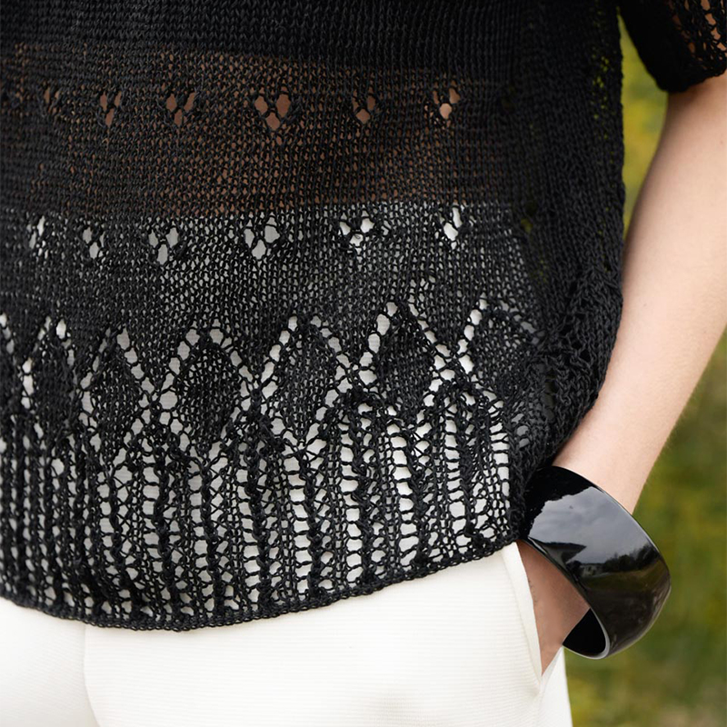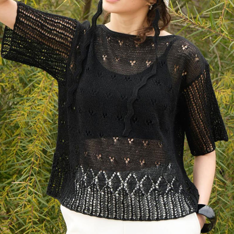 清涼感のある編み上がりは、リネン100%の糸のなせる業。全体に散らした小さな透かし模様と、裾に浮かび上がるダイヤ柄の対比が美しい。