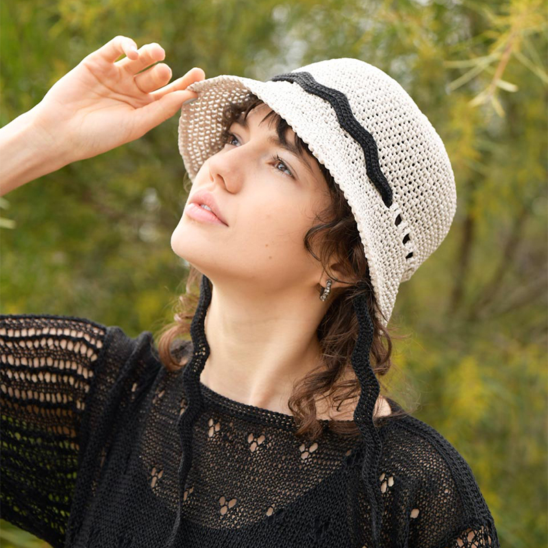かぶりやすいバケットハットは、透かし部分にブレードを通して自由にアレンジができます。時にははずしたり、市販のリボンで雰囲気を変えても。