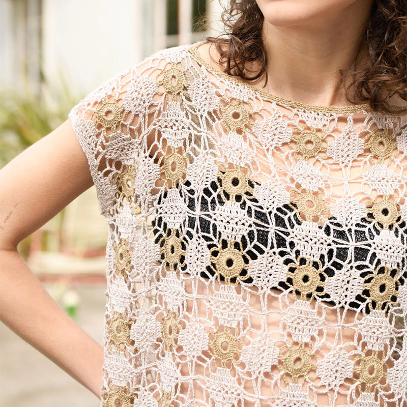 編みやすくてどんどん編めるモチーフはちょっとビターなテイストで。透け感の大きなまっすぐシルエットのプルオーバーは、重ね着を楽しむのにぴったり。シンプルなスカートやパンツはもちろん、ワンピースの上にも、ウォーターリゾートのお供としても活躍する、大人のアクセサリーウエアです。
