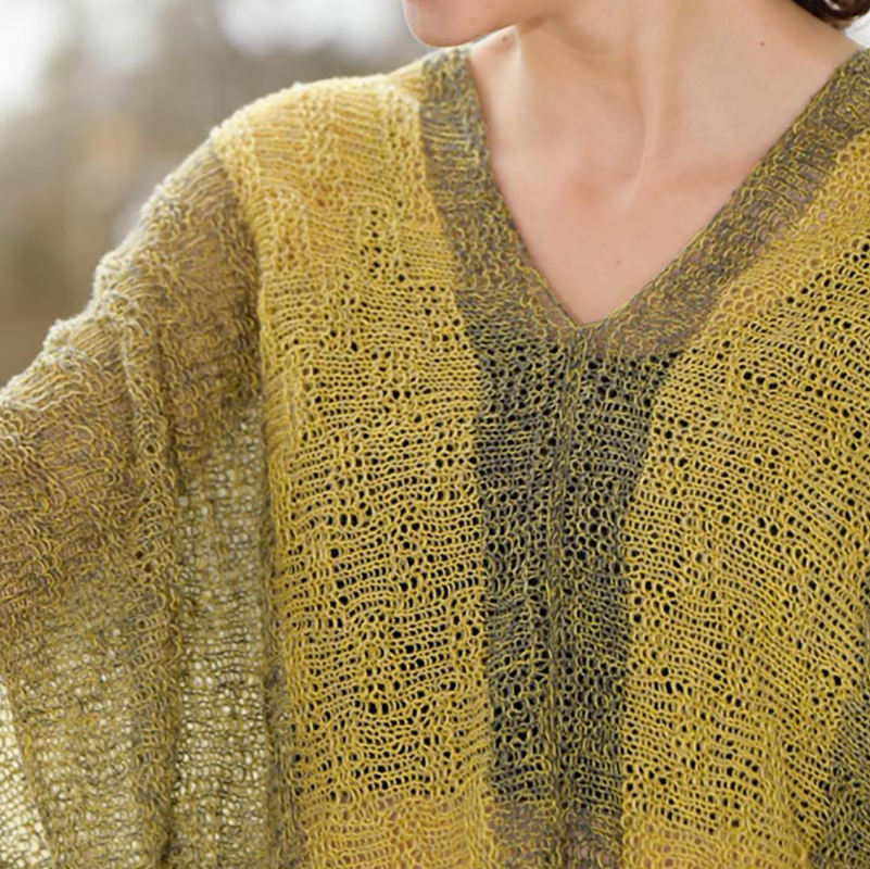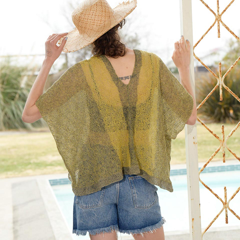 横編みの前後身頃はねじり増し目で肩下がりを作り、2枚を中央と脇ではいでざっくりしたプルオーバーに仕立てます。細いリネン糸3本どりの組み合わせで色の変化を楽しんで。二の腕は見せたくないけど暑いのはイヤ、というワガママに応えてくれる、風の抜けるシースルーウエアです。