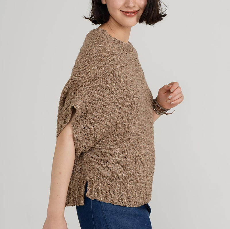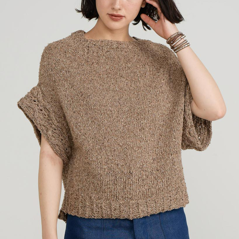 今回は夏のウエアには珍しく、太糸でザクザク編むプルオーバーにしました。1枚で着るのはもちろんですが、ベストとしても着られるので、ぜひ重ね着のコーディネートも楽しんでくださいね。