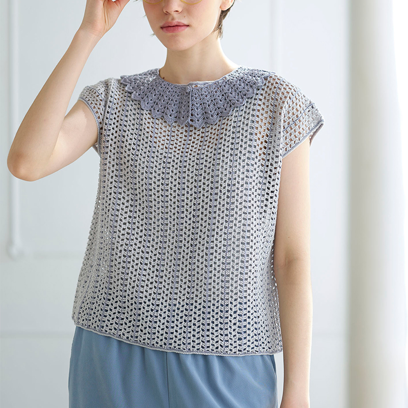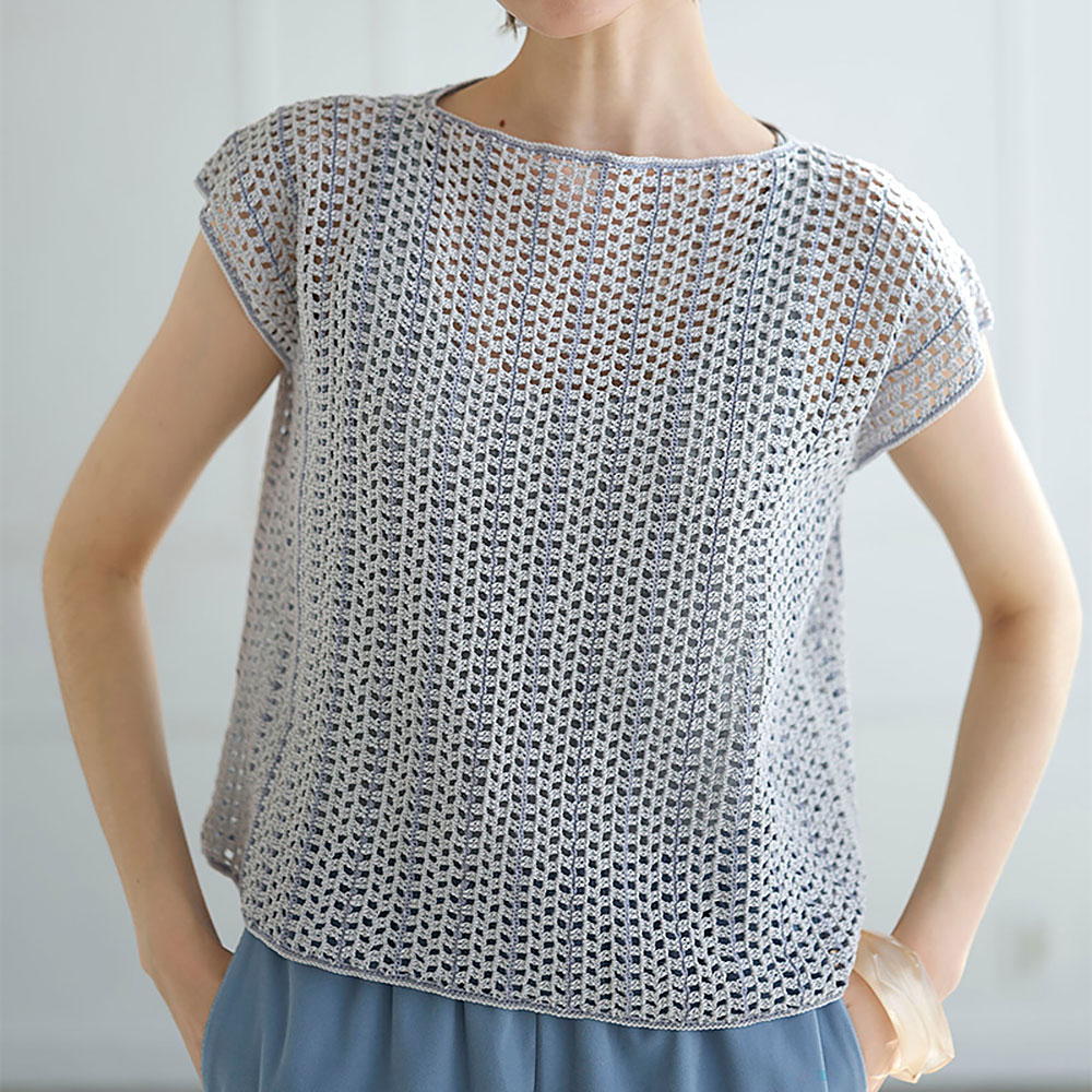 光沢のある2色の縞でまっすぐ編み、衿ぐりから左右に分けて編んだノースリーブのプルオーバー。ラダーリボンを並べたような面白い模様は、2目の方眼編みを横編みにしています。アクセントカラーで編んだつけ衿とのコンビネーションを楽しんで。