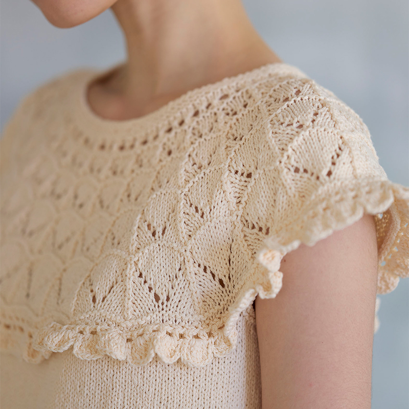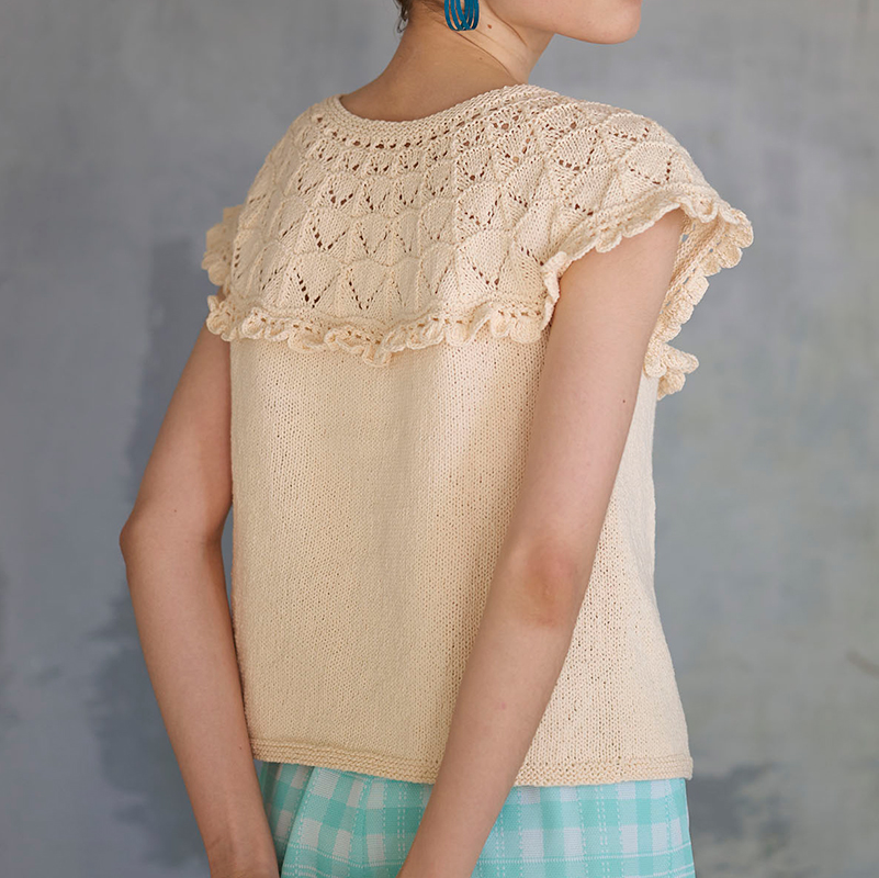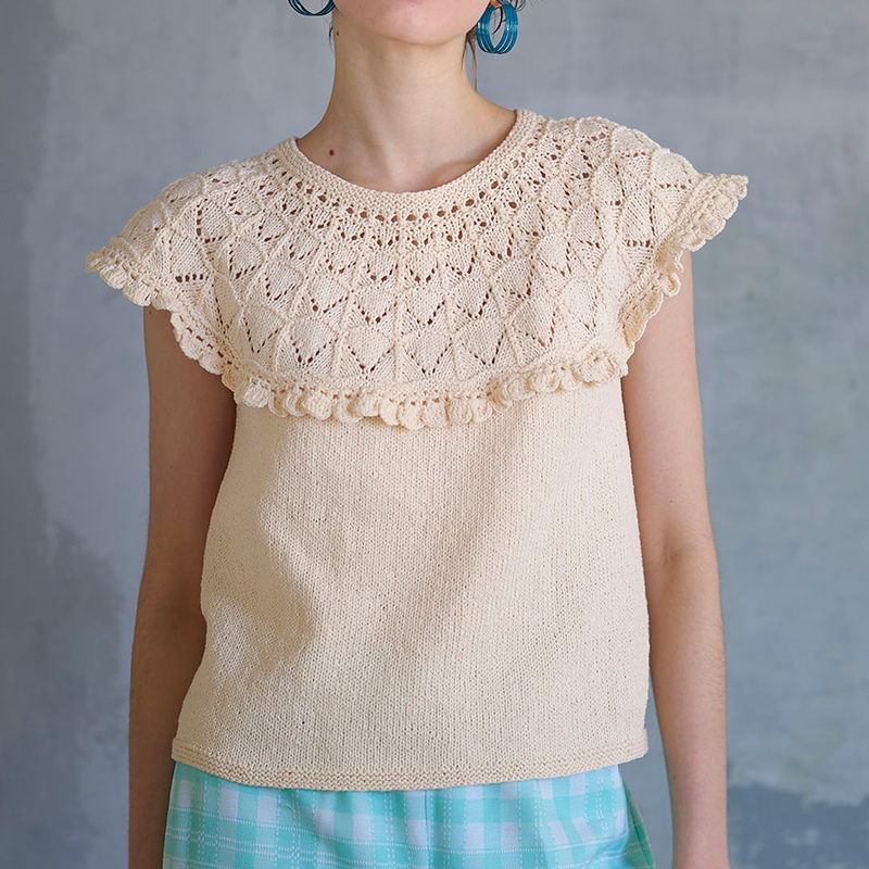 さらっとしたコットン素材とシンプルな透かし模様で夏らしいアイテムに仕上がります。フリルは最後に編みつけるので、お好みでどうぞ。