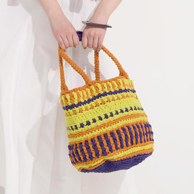 夏こそマストなかご型のマルシェバッグ。日差しに映えるカラフルな配色が絶対的に気分なのに、夏素材ではヘビーな重さになりがち。そんなお悩みはエアーチュールにお任せ。軽いだけでなく夢のように少ない目数段数にも驚きます。