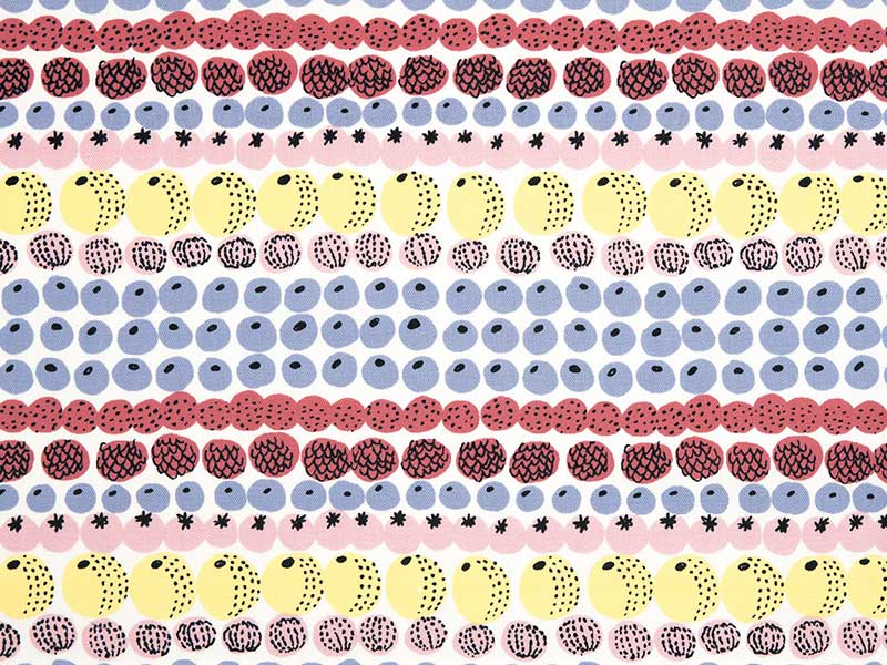 [オックス] やや厚手のオックス地に、北欧の人々の元気の元・ベリーを並べたボーダープリント布です。ニュアンスカラーを生かしたバッグやインテリアなどに。