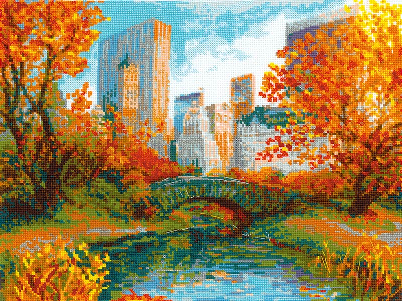 【キット作り方つき】ニューヨーク・セントラルパークの秋の景色を、温かみのある極細毛糸でクロスステッチ。燃えるような紅葉が摩天楼に美しく映えます。上級の方へ。リトアニア・RIOLIS社製。