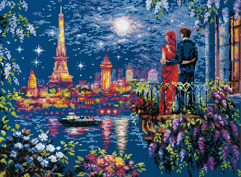 【キット作り方つき】美しいパリの夜景を楽しむ恋人たちを描いたクロスステッチ作品。薄雲のべールをまとった月がロマンチックな雰囲気を盛り上げます。上級の方へ。ラトビア・Magic needle社製(マジックニードル)。