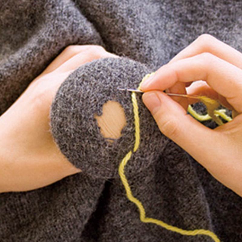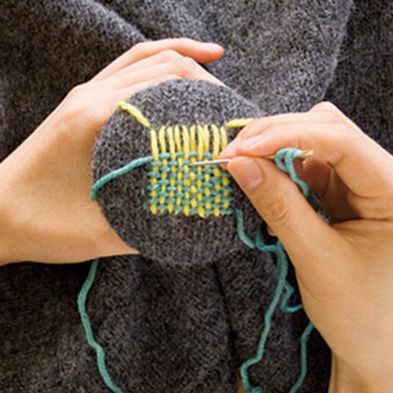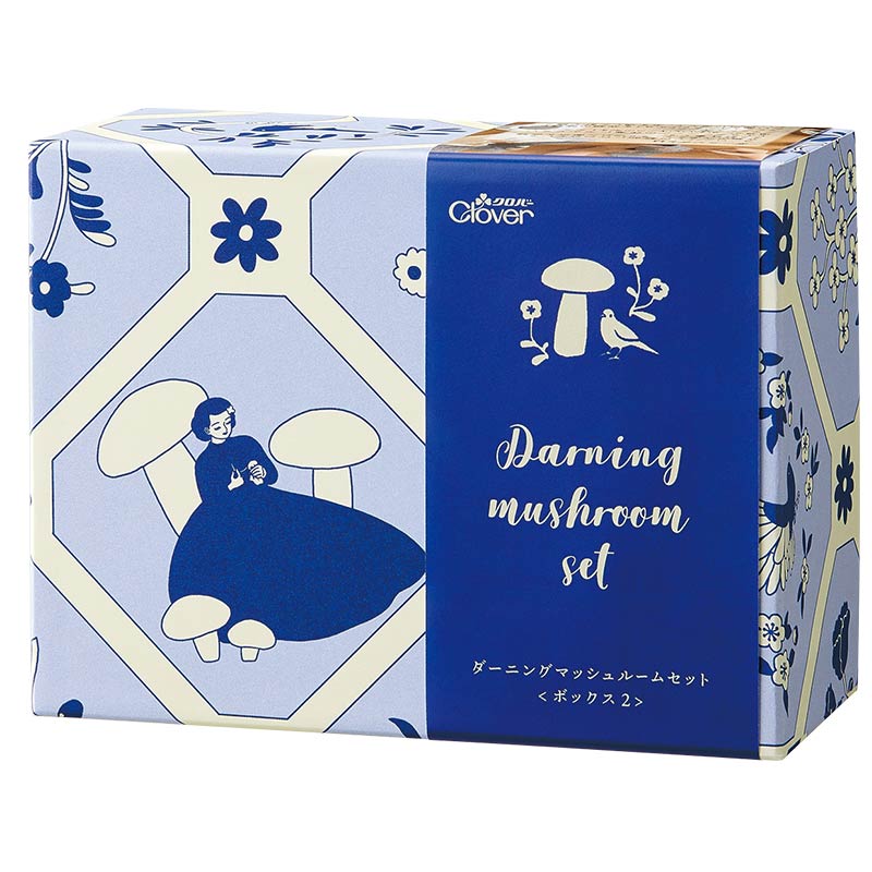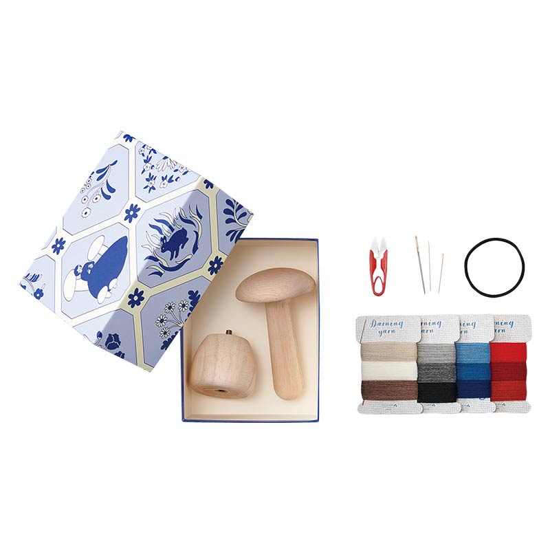 ダーニングとは、ヨーロッパ伝統の修繕技術。キノコ型のアイテムと毛糸で、穴の空いた靴下や衣類を簡単に補修でき、包みボタンのブローチなども作れます。糸やはさみもついた便利なボックス入りセットです。